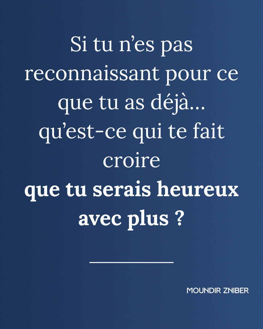 ✨ Tu crois que tu seras plus heureux en ayant plus ? Plus d’argent. Plus de succès. Plus d’amour. Plus de reconnaissance. Mais si tu n’arrives pas à ressentir de la gratitude pour ce que tu as déjà maintenant… ce “plus” ne fera que nourrir un vide. On pense que le bonheur viendra quand on atteind...Read more